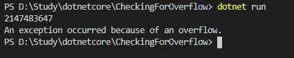 Console.WriteLine("An exception occurred because of an overflow.");
