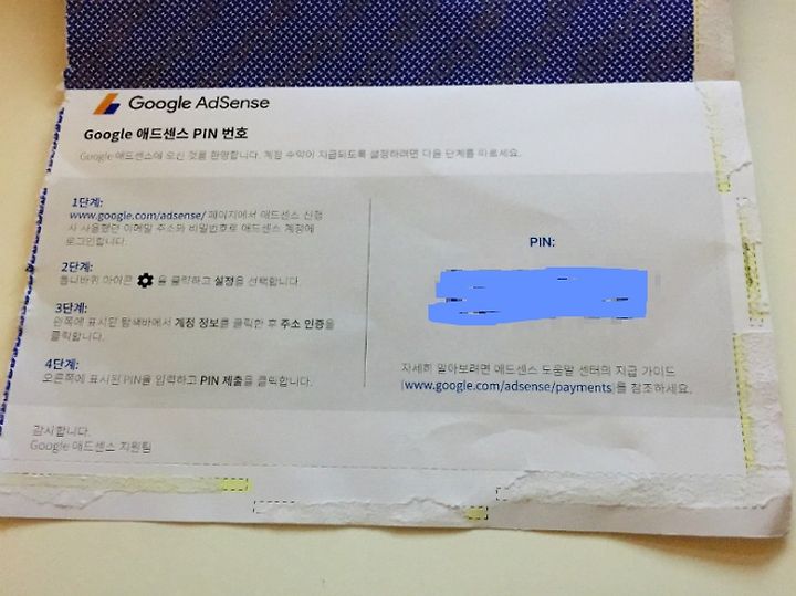 구글 애드센스로 수익이 10달러가 넘게 되면 핀 코드 등록을 해야 합니다.